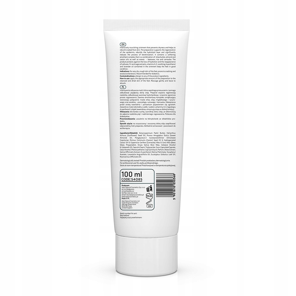 Intensywnie odżywcza maść, która zapobiega przesuszeniu i pomaga odbudować popękaną skórę stóp. Preparat wspiera regenerację naskórka, odbudowuje warstwę hydrolipidową i znacznie ogranicza proces rogowacenia. Zawiera emolientowy kompleks zmiękczający stanowiący połączenie: masła shea, oleju migdałowego i rycynowego oraz wosków – pszczelego, ryżowego i karnauba. Zabezpiecza przed utratą nawilżenia i ponownym pojawieniem się zgrubień.