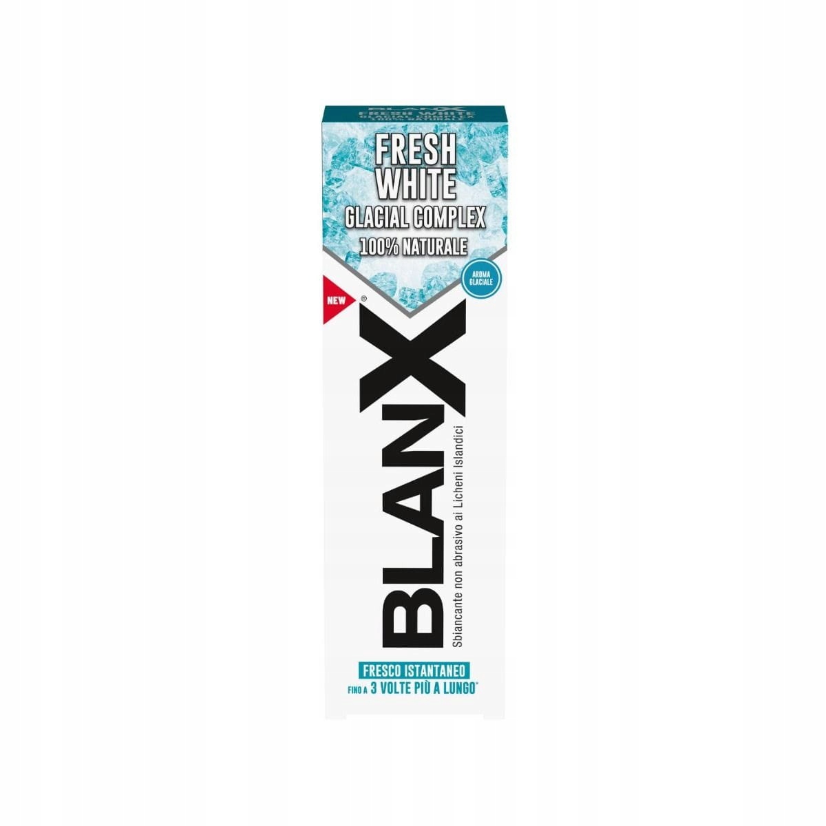 Glacial Complex, wzbogacony o wodę glacjalną, zapewnia paście BlanX efekt orzeźwienia, podczas gdy dodatek czerwonych jagód i algi islandzkiej wzbogacają formułę o właściwości antyoksydacyjne. Porosty islandzkie znane są ze swoich właściwości antybakteryjnych, zapewniają głębokie oczyszczanie bez efektu abrazyjnego.