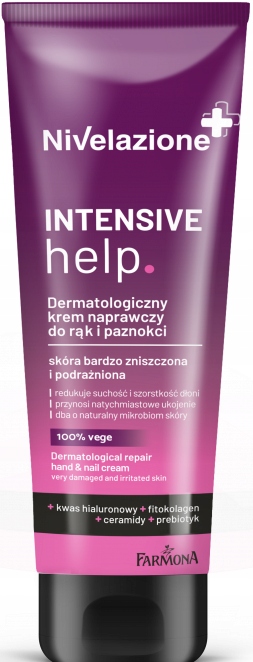 Jeśli skóra Twoich rąk jest bardzo zniszczona lub podrażniona, sięgnij po Nivelazione Dermatologiczny krem naprawczy, stworzony przez ekspertów Laboratorium Kosmetyków Naturalnych FARMONA, we współpracy z dermatologami. Krem działa jak ochronne rękawiczki – regenerujei zabezpiecza skórę przed szkodliwym działaniem detergentów, czynników zewnętrznych oraz nadmiernym wysuszeniem.