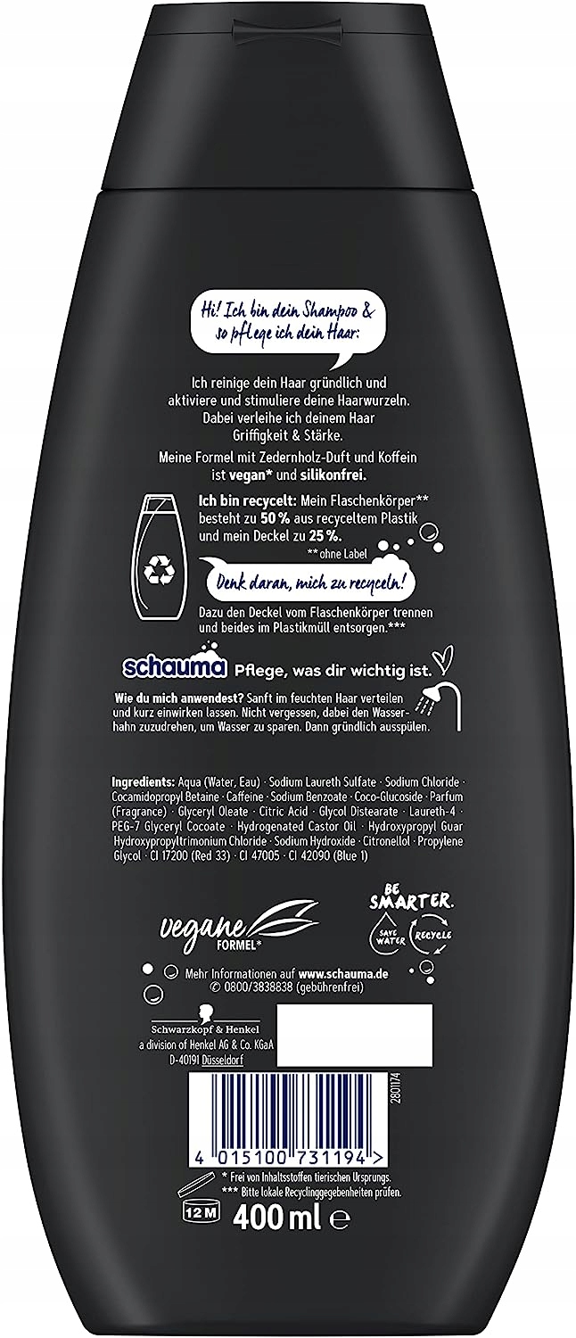 skład:Aqua (Water, Eau), Sodium Laureth Sulfate, Sodium Chloride, Cocamidopropyl Betaine, Caffeine, Sodium Benzoate, Coco-Glucoside, Parfum (Fragrance), Glyceryl Oleate, Citric Acid, Glycol Distearate, Laureth-4, PEG-7 Glyceryl Cocoate, Hydrogenated Castor Oil, Hydroxypropyl Guar Hydroxypropyltrimonium Chloride, Sodium Hydroxide, Citronellol, Propylene Glycol, CI 17200 (Red 33), CI 47005, CI 42090 (Blue 1)