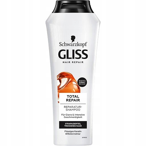 Szampon Gliss Total Repair z hydrolizowaną keratyną i nektarem kwiatowym przeznaczony do włosów suchych i zniszczonych. Jego formuła zmniejsza łamliwość włosów aż o 85%, przywracając elastyczność i zdrowy, lśniący wygląd. Produkt działa regenerująco, poprawiając kondycję włosów w porównaniu do włosów zniszczonych.
