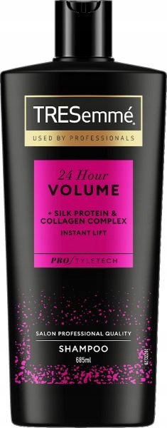 Szampon TRESemmé 24 Hour Volume do cienkich pasm pomaga zachować salonową jakość, całodzienną objętość, utrwalenie i elastyczność bez obciążania włosów. Szampon zapobiega spłaszczaniu się włosów, zapewniając efekt bujnej fryzury, dzięki formule z technologią Pro Style zawierającą proteiny jedwabiu i kolagen, a także aminokwasy i ceramidy. TRESemmé jest dumną marką kosmetyków do pielęgnacji włosów zatwierdzoną przez PETA (People for the Ethical Treatment of Animals).