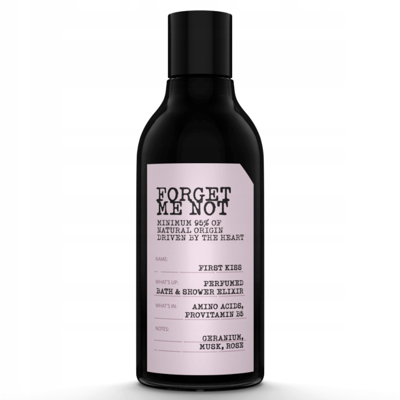 First Kiss z linii Forget Me Not to niezapomniane nuty słodyczy, emocje i piękne wspomnienia. Poznaj naturalny, stworzony z pasją, Perfumowany eliksir do kąpieli i pod prysznic o właściwościach regenerujących, który zapewnia holistyczną pielęgnację i poprawia nastrój. Starannie opracowana, wegańska receptura zawiera aż 95% składników pochodzenia naturalnego i zapewnia skuteczne działanie. Ekstrakty z piwonii i chabra nawilżają i wygładzają skórę, aminokwasy regenerują i poprawiają wygląd skóry, prowitamina B5 intensywnie nawilża, regeneruje i łagodzi podrażnienia, a olejek geraniowy relaksuje, wycisza i koi. Dodatkowo cudowne nuty zapachowe geranium, róży i piżma przywołują piękne wspomnienia. To właśnie Twoja chwila relaksu.